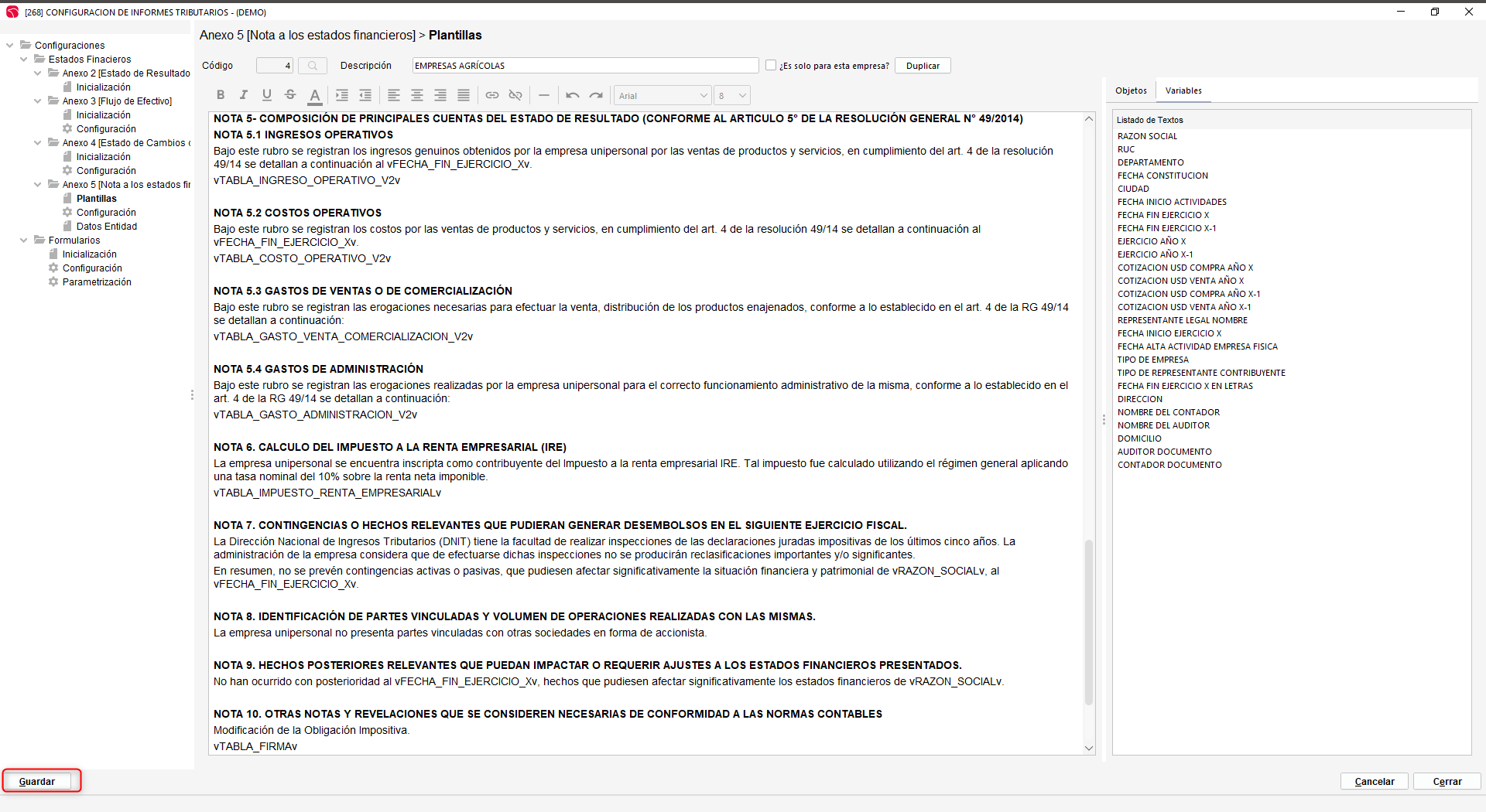 Las variables son referencias a datos existentes en el sistema, por ejemplo: "Raz贸n social" de la empresa, si agregamos esta variable en alg煤n campo de nuestra plantilla, al generar nuestra nota, este ser谩 reemplazado por el detalle que hayamos agregado en el form 2, del apartado de "Raz贸n social".