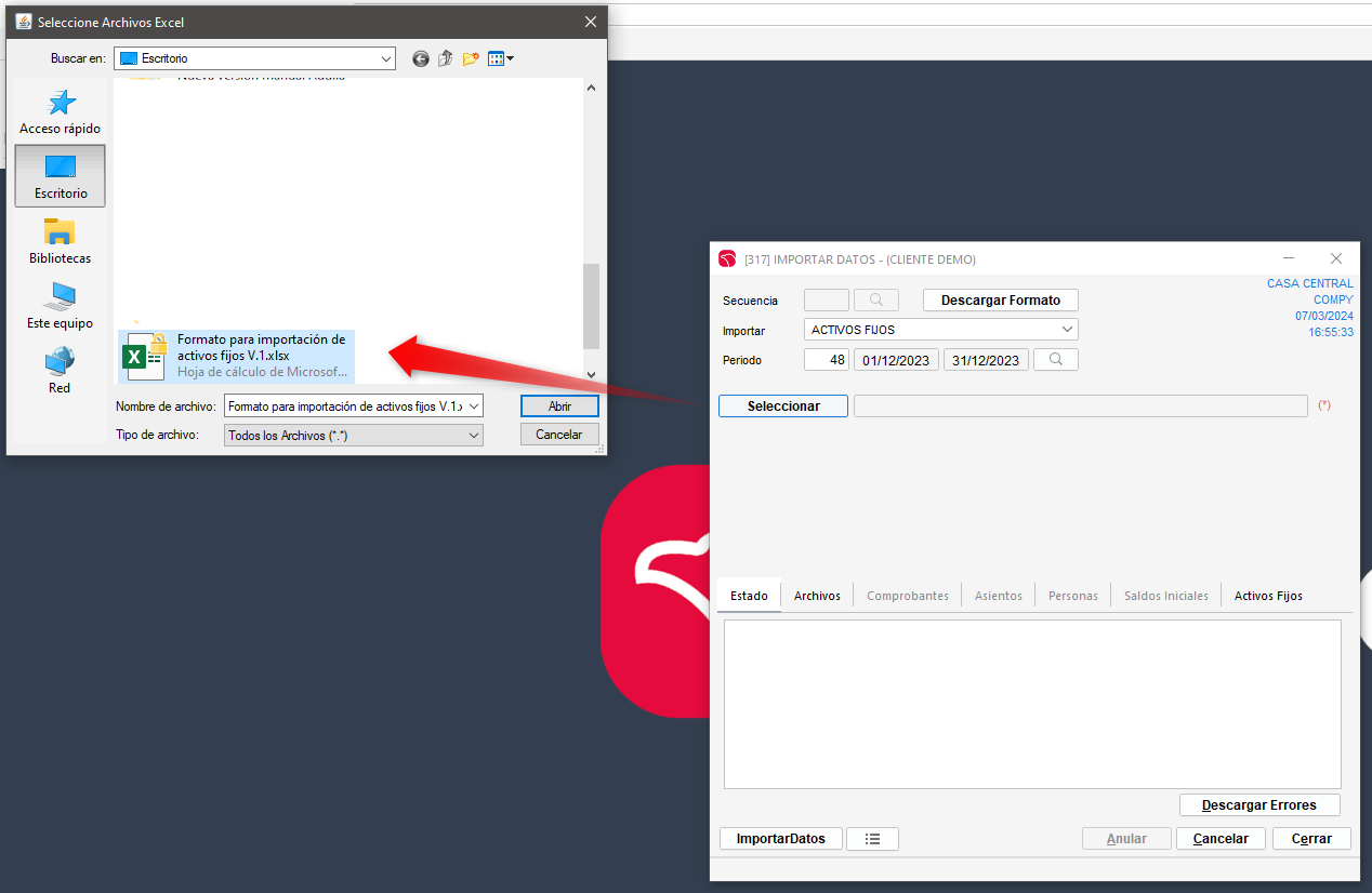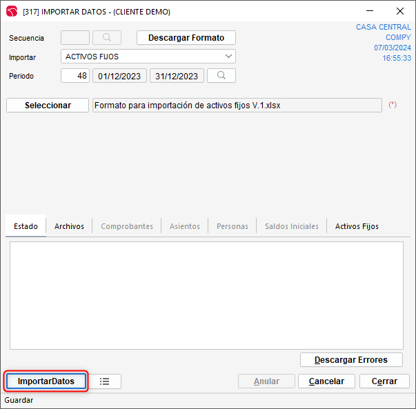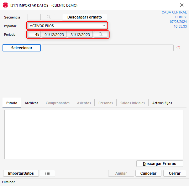 c - Seleccionamos el tipo de importaci贸n "Activos fijos" y el periodo.